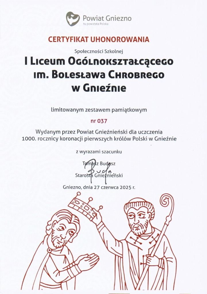 Fundacja Edukacyjna "Perspektywy" potwierdza, że I LICEUM OGÓLNOKSZTAŁCĄCE IM. BOLESŁAWA CHROBREGO w Gnieźnie jest wśród 500 najlepszych liceów w Polsce sklasyfikowanych w Rankingu Szkół Ponadgimnazjalnych PERSPEKTYWY 2026 i przysługuje mu tytuł "Srebrnej Szkoły 2026". |