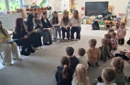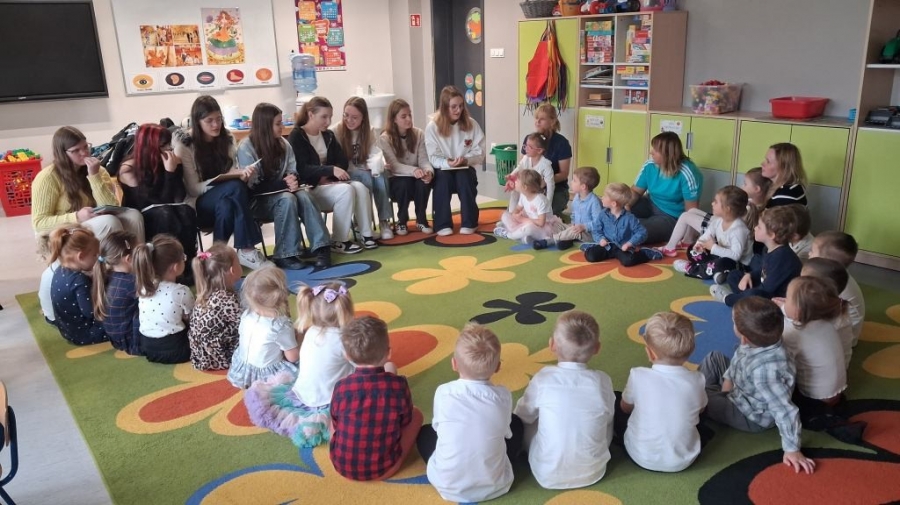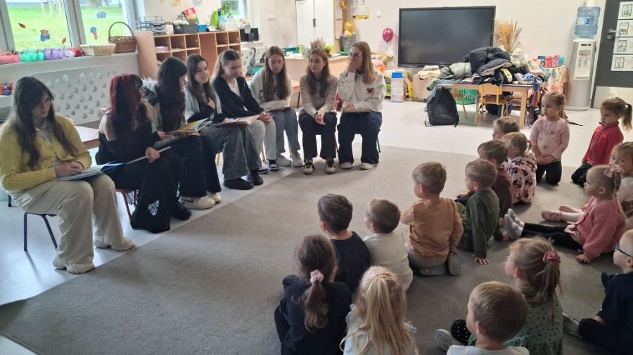 We wtorkowe przedpołudnie 30 września młodzież z Koła Sympatyków Biblioteki: Blanka Kowalska z kl. 1d, Antonina Kuroczycka-Saniutycz z kl.3, Martyna Kistowska i Amelia Ręklewska z kl. 3f, Klara Kuroczycka-Saniutycz z kl.4c oraz Martyna Musiałowska, Marcelina Owczarek i Jagoda Sekulska z kl.4e odwiedziła dzieci z zaprzyjaźnionego przedszkola „Leśne Ludki”, zlokalizowane w tym roku w Szkole Podstawowej nr 3 w Gnieźnie.