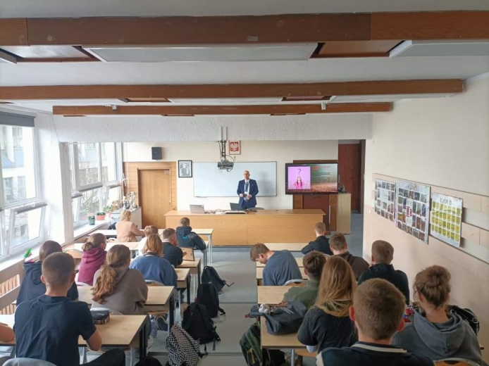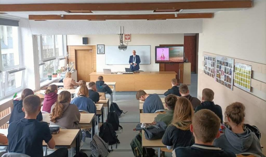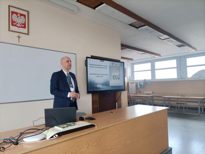 26 marca 2026 roku uczniowie klasy 2a wzięli udział w spotkaniu z Markiem Kopaczem ekspertem ds. zrównoważonego rozwoju z Banku Spółdzielczego w Gnieźnie. Tematem wykładu było ESG, czyli podejście do prowadzenia działalności gospodarczej z uwzględnieniem troski o środowisko, społeczeństwo oraz odpowiedzialne zarządzanie.