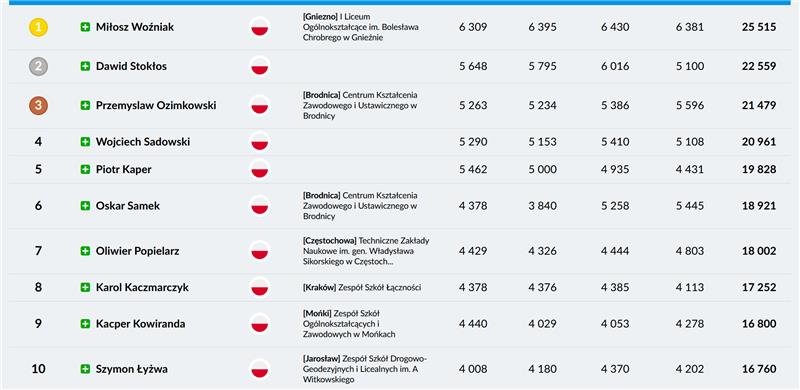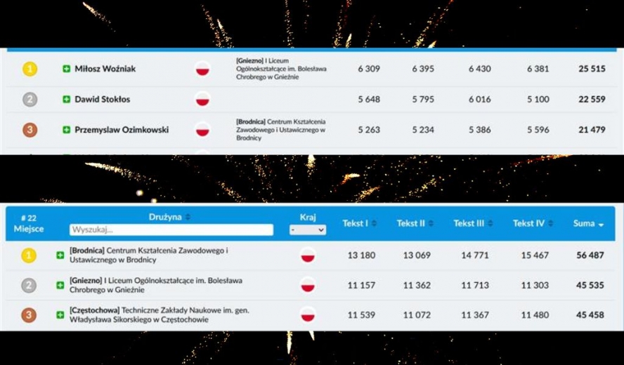 W kategorii wiekowej naszych uczniów w konkursie brało udział 139 osób. Indywidualnie zwyciężył Miłosz Woźniak z klasy 4a, zdobywając 25 515 punktów (średnia prędkość 637,8 znaków na minutę), a osoby na drugim i trzecim miejscu zdobyli 22 559 i 21 479 punktów. Drużynowo wraz z Miłoszem czyli Michał Kowalski, Mateusz Wiśniewski i Jakub Drzewiecki spośród wszystkich 22 szkół ponadpodstawowych zajęła II miejsce z wynikiem 45 535 pkt.