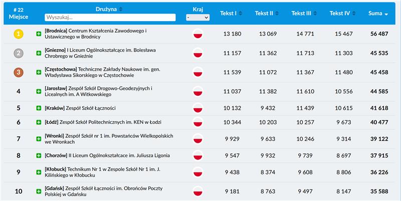 Poniżej tabeli indywidualnej i drużynowej a także naszych poszczególnych wyników (pod uwagę były brane 3 najlepsze wyniki uczestników drużyny na dany tekst)