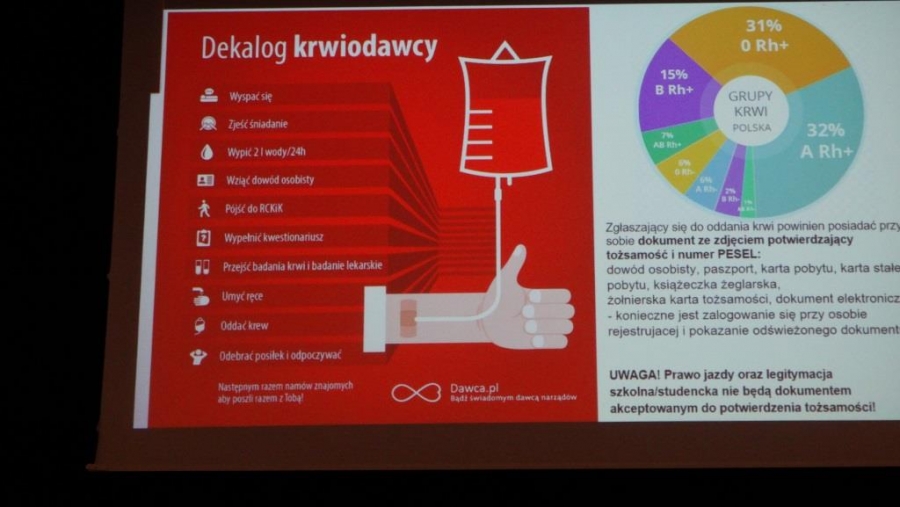 W spotkaniu wzięli udział uczniowie klas czwartych. Wykład składał się z dwóch części. W pierwszej młodzież dowiedziała się kto może zostać dawcą szpiku i w jaki sposób można zarejestrować się w bazie DKMS. Druga część poświęcona była honorowemu krwiodawstwu. Prelegent przedstawił jaki jest odsetek ludzi z konkretną grupą i odczynnikiem Rh w naszym społeczeństwie, jakie to niesie za sobą konsekwencje, kto może być honorowym dawcą krwi i dlaczego warto oddawać krew. Uczniowie zdobyli sporo cennych informacji, co z pewnością pomoże im podjąć decyzję podczas najbliższej akcji oddawania krwi, która odbędzie się 15 grudnia.