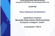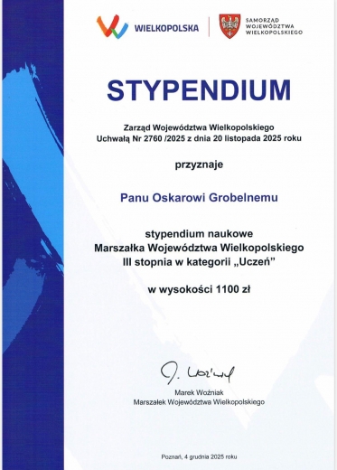 Miło nam poinformować, że w miniony czwartek nasz uczeń Oskar Grobelny odebrał stypendium naukowe z rąk Marszałka Województwa Wielkopolskiego.
