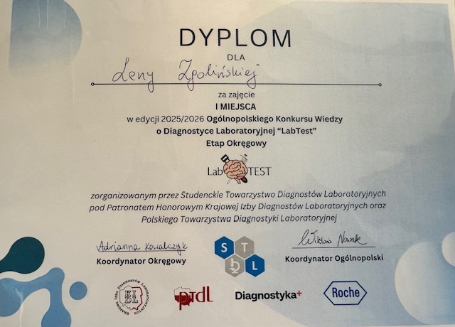 Serdecznie gratulujemy Lenie Zgolińskiej z kl. III c zajęcia I miejsca w etapie okręgowym Ogólnopolskiego Konkursu Wiedzy o Diagnostyce Laboratoryjnej "LabTest", który odbył się 7 marca 2026 w Collegium Pharmaceuticum Uniwersytetu Medycznego im. Karola Marcinkowskiego w Poznaniu.