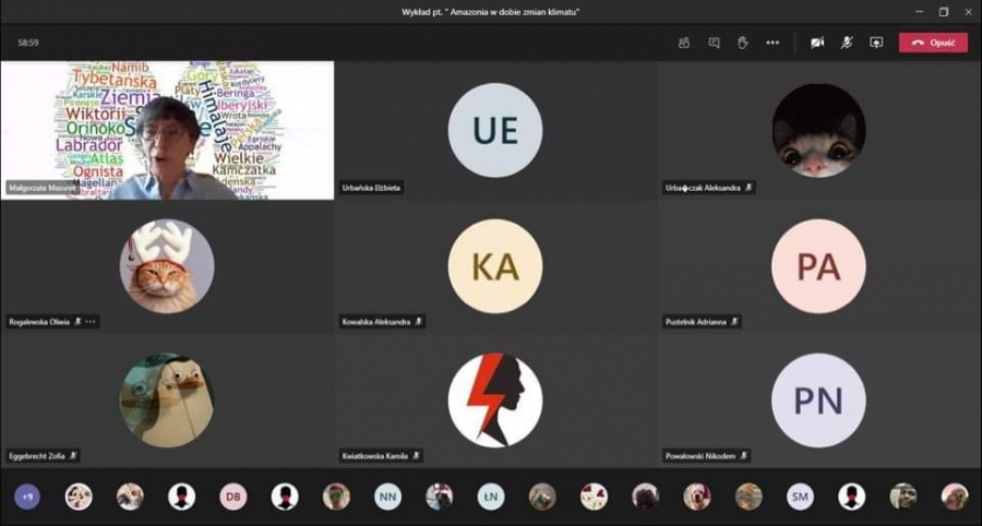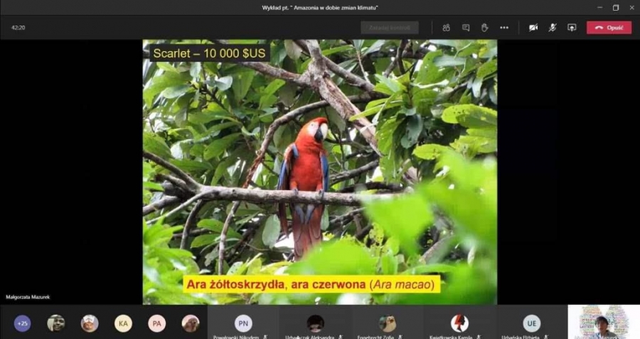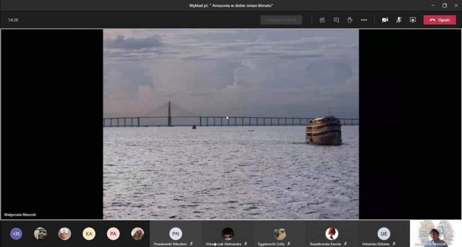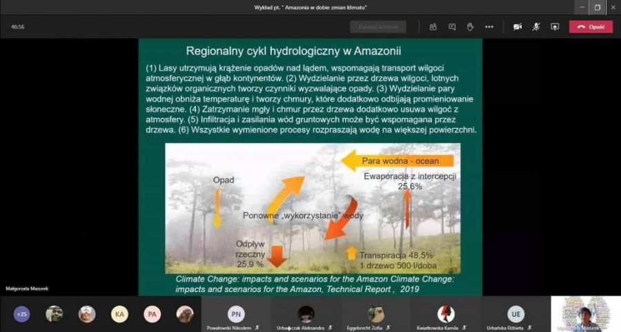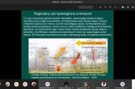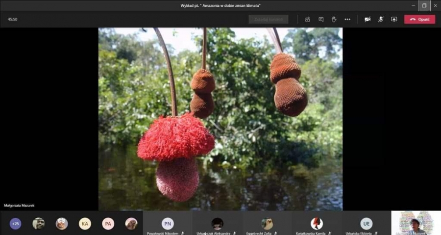 Pani profesor Małgorzata Mazurek w swoim wykładzie Amazonia w okresie zmian klimatu zabrała nas w wirtualną podróż brzegami rzek Niziny Amazonki. Mogliśmy docenić jej piękno i dowiedzieć się o czynnikach jej zagrażających. Sama Nizina obejmuje obszar 3.5 miliona km2, a całe dorzecze Amazonki to prawie 7 milionów km2. Amazonia znajduje się w strefie około równikowej, co oznacza, że jest podatna na zmiany klimatu. Dowiedzieliśmy się, że jest to strefa o klimacie gorącym, wilgotnym, z dużym nasłonecznieniem i mało żyznym glebami, co oznacza, że rośliny i zwierzęta zajmujące te obszary musiały wykształcić sobie dużo cech pomagających im przetrwać w takich warunkach. Jednymi z takich roślin o ciekawych cechach szczególnych są liany, które rywalizują z innymi roślinami o dostęp do światła, rosną ku górze korzystając z pni drzew, czasami same osiągając grubości takiego pnia. Ciekawymi roślinami w Amazonii są również epifity- rośliny, które korzystają z innych roślin jako podpór np. storczyk, kakaowiec właściwy. Kolejną wartą uwagi rośliną występującą w Amazonii jest wiktoria królewska, której liście mają średnicę ok. 1 metra i są w stanie utrzymać na swojej powierzchni nawet niemowlę. Unoszą się one na powierzchni rzek. Amazonia ma zupełnie inne oblicze nocą, gdyż właśnie wtedy otwierają się kwiaty gotowe na zapylenie przez nietoperze. Interesującymi zwierzętami Amazonii są głównie ryby, które mogą osiągać rekordowe rozmiary oraz ssaki, takie jak delfiny, manaty oraz piękne ptactwo, np. kolorowe ary.
