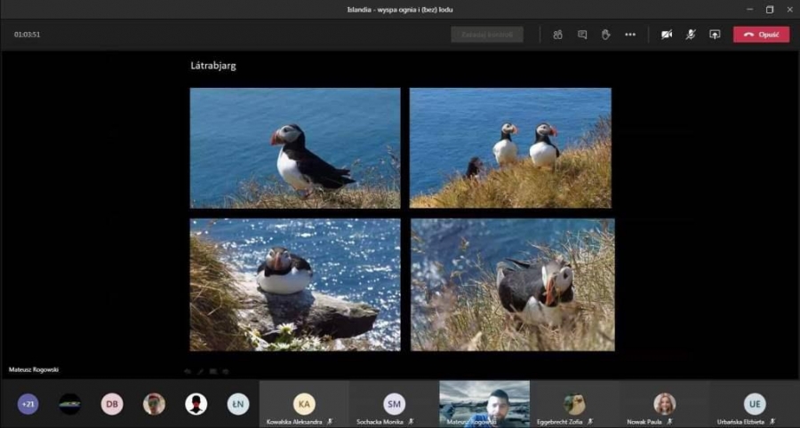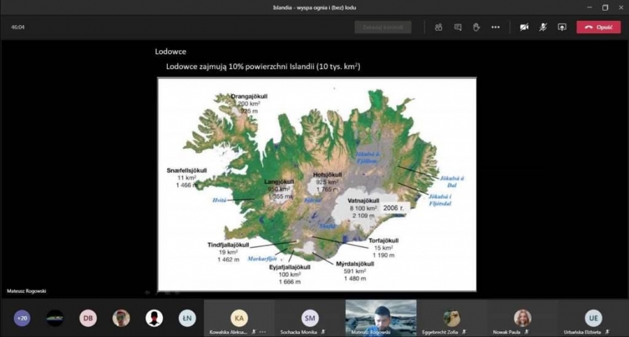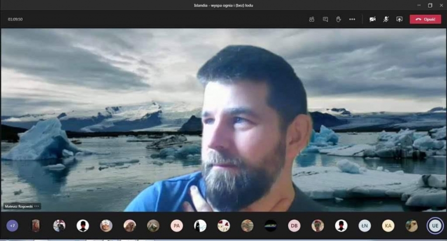W kolejną podróż zabrał nas doktor Mateusz Rogowski podczas prelekcji Islandia -wyspa ognia i (bez)lodu pokazując nam kraj w dużych obszarach i prawie bez ludzi. Jego liczba ludności wynosi 396 tyś. mieszkańców. Co ciekawe, aż 7% z nich to mniejszości etniczne, największa z nich około 20 tyś. to Polacy. Krajobraz Islandii stanowią skały wulkaniczne, aktywna strefa wulkaniczna wzdłuż ryftu i obszary geotermalne .Klimat Islandii charakteryzuje zmienność pogody, nawet co 5 minut, silny wiatr utrudnia podróże rowerzystom. Temperatura sięga do 14-15 stopni latem, a zima 0 stopni na obrzeżach. Lodowce zajmują 10% powierzchni Islandii (10 tys. Km2) - największy Vatnajokull . Na Islandii najkrótszy dzień 4godziny a najdłuższy 21 godzin w okresie lipca, czerwca.