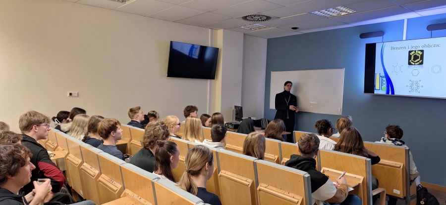 Ważnym elementem zajęć był wykład Pana dr inż. Łukasza Ławniczaka pt. „50 twarzy benzenu”. Pan doktor przypomniał nam na czym polega aromatyczność i pomógł zrozumieć w jaki sposób reagują związki aromatyczne.